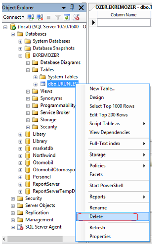 Merhaba arkadaşlar, MS-SQL veritabanımızdan tablo silmek için aşağıdaki yöntemleri kullanabiliriz. İlk olarak Object Explorer'dan veritabanımızın içeriğini açıp, Tables kısmından sileceğimiz tabloya sağ tık yapıyoruz ve Delete'i tıklıyoruz.