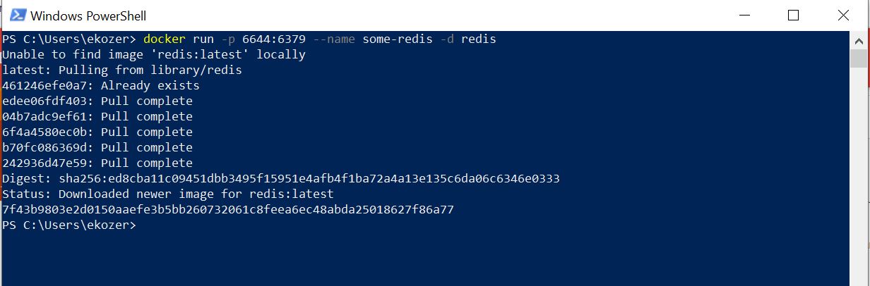 Dockerhub üzerinden resmi redis imajının detayına bu adresten ulaşabilirsiniz. https://hub.docker.com/_/redis Sayfada imajı nasıl kullanacağımız How to use this image başlığı altında yazıyor. Bilgisayarımda docker ayaktayken PowerShell'i açıyorum ve aşağıdaki komutla redis kurulumunu yapıyorum.