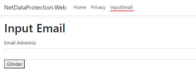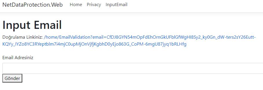 Bu metodda ilk satırda parametre olarak gelen email verisini şifreledim, ikinci satırdı kullanıcıya tıklaması için vereceğim linki oluşturdum, üçüncü satırda ise modelleme yapmadığım için oluşturduğum datayı kullanıcıya gösterebilmek için ViewBag'e attım. Kullanıcı inputa herhangi bir yazıp post ederse eğerse eğer (konumuzun dışında olduğu için inputa ek bir validasyon koymadım, şu haliyle mailden başka bir veride girebilir) sayfa post olduktan sonra aşağıdaki şekilde görünecek;
