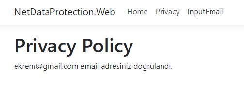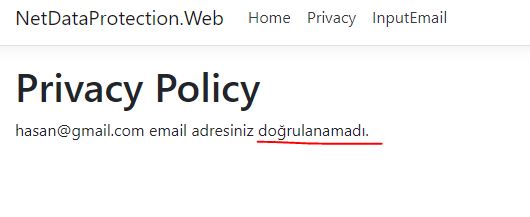Bu metotda da ilk satırda parametre olarak gelen email datasını çözüyor, ikinci satırda ise controllerin üstünde oluşturduğumuz email listesinde çözdüğü emailin olup olmadığını kontrol ediyor, üçüncü satırda ise kullanıcıya döneceği mesajı oluşturuyor. Kullanıcı inputa ekrem@gmail.com yazıp sonra gelen linke tıklamış olursa aşağıdaki mesajı almış olacakır.