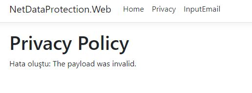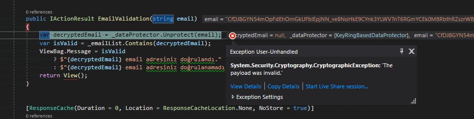 Exception bloğunun aldığı parametrenin tipini CryptographicException olarak değiştirmemiz hatayı daha sağlıklı yakalamamızı sağlayacaktır. Bu haliyle süresi dolmuş bir linke tıkladığımızda kullanıcı aşağıdaki responsu alacaktır.