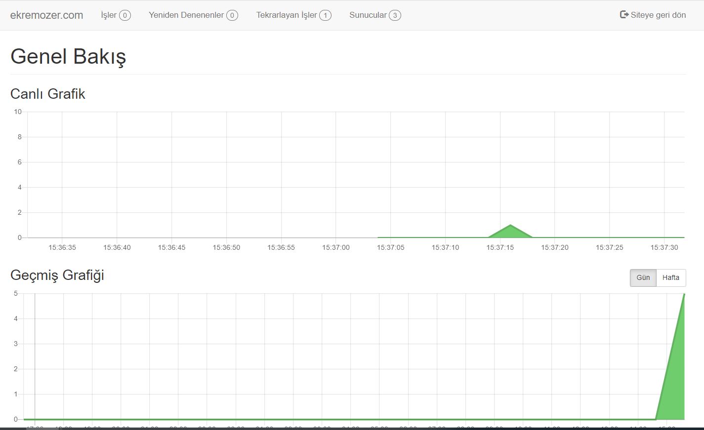 Panelin ana sayfasında Canlı grafik ve Geçmiş grafik olarak çalışan joblarımı görebiliyorum. Örneğin canlı grafikte 15:37 de ben paneldeyken RecurringJob'ım 1 kez tetiklendi.