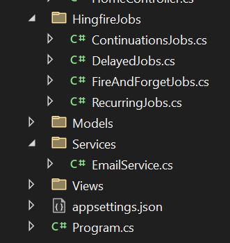 Bu class'ın email gönderdiğini varsayarak hangfire joblarımı kodlayacağım. Projeme HingfireJobs adında bir klasör açıp içerisine her job türü için birer class ekliyorum.