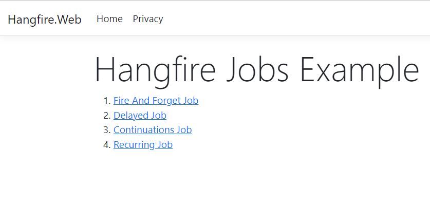 Örnek kodlarımızı ve cron yapısını anlattıktan sonra şimdi joblarımızı tetikleyerek hangfire panelini inceleyelim. Ben her job için HomeController'a birer action ekleyip link ile tetikleyeceğim. Actionları ekledikten sonra ana sayfama linkleri ekleyip tek tek tetikliyorum.