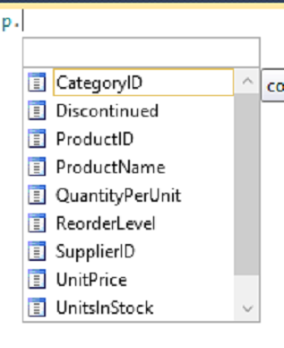 NOT: Yukarıdaki sorgu cümlesinde tablolardan sonda gelen tek harflik kısaltmaya Alias denir. Bu kullanım şekili ile tabloya verdiğimiz alias'ı yazıp noktaya"." bastığımız zaman sadece o tabloya ait kolonları görmemizi sağlar örnek olarak "Products p" kullanımı bize aşağıdaki kolaylığı sağladı;