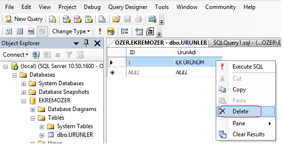 Merhaba arkadaşlar, MS-SQL üzerinden veri silmemiz gerektiğinde aşağıdaki yöntemleri kullanarak verilerimizi silebiliriz. Object Explorer'dan veritabanımızın tablolar sekmesini açıyoruz ve veri sileceğimiz tabloya sağ tıklayıp Edit Top 200 Rows(İlk 200 Satırı Düzenle) seçeneğini tıklıyoruz. Sonra açılan pencerede sileceğimiz satırı seçiyoruz ve sağ tık yapıp Delete'e tıklıyoruz.