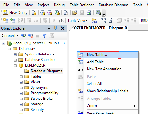 Object Explorer'dan veritabanımızın içeriğini açıyoruz Database Diagrams'ın üzerine gelip sağ tık yapıyoruz ve New Database Diagram'ı tıklıyoruz.