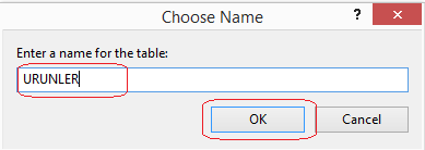 Sonra açılan pencereye tablomuzun adını beliliyoruz ve OK'a tıklıyoruz.