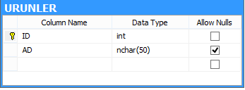 Sonra açılan pencerede tablomuzun adını, veri tipini, ve boş değer alıp alamayacağını belirliyoruz.