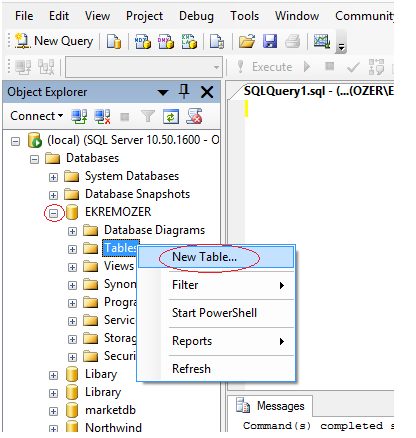Merhaba arkadaşlar, bu yazımda MS-SQL Server üzerinde Veritabanımız için tablo oluşturmaktan basedeceğim. Object Explorer'da veritabanımızın solundaki + işaretine tıkalayıp içeriğini açtıktan sonra Tables'ın üzerine geliğ sağ tık yaptıktan sonra New Table'ı tıklıyoruz.