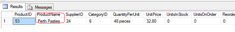 Yukarıdaki sorguda Products tablosundaki ProductName kolonundaki verilerin Perth Pasties'e eşit olmasını şart koştuk. Sorgunun bize döneceği tablo aşağıdaki gibidir;